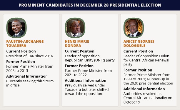 The Constitutional Court approved seven presidential candidates on November 14, including President Faustin-Archange Touadera of the ruling United Hearts Movement (MCU) party, seeking a third term in office. The two most prominent candidates opposing him are Anicet-Georges Dologuele of the opposition Union for Central African Renewal (URCA) party and former prime minister Henri-Marie Dondra.